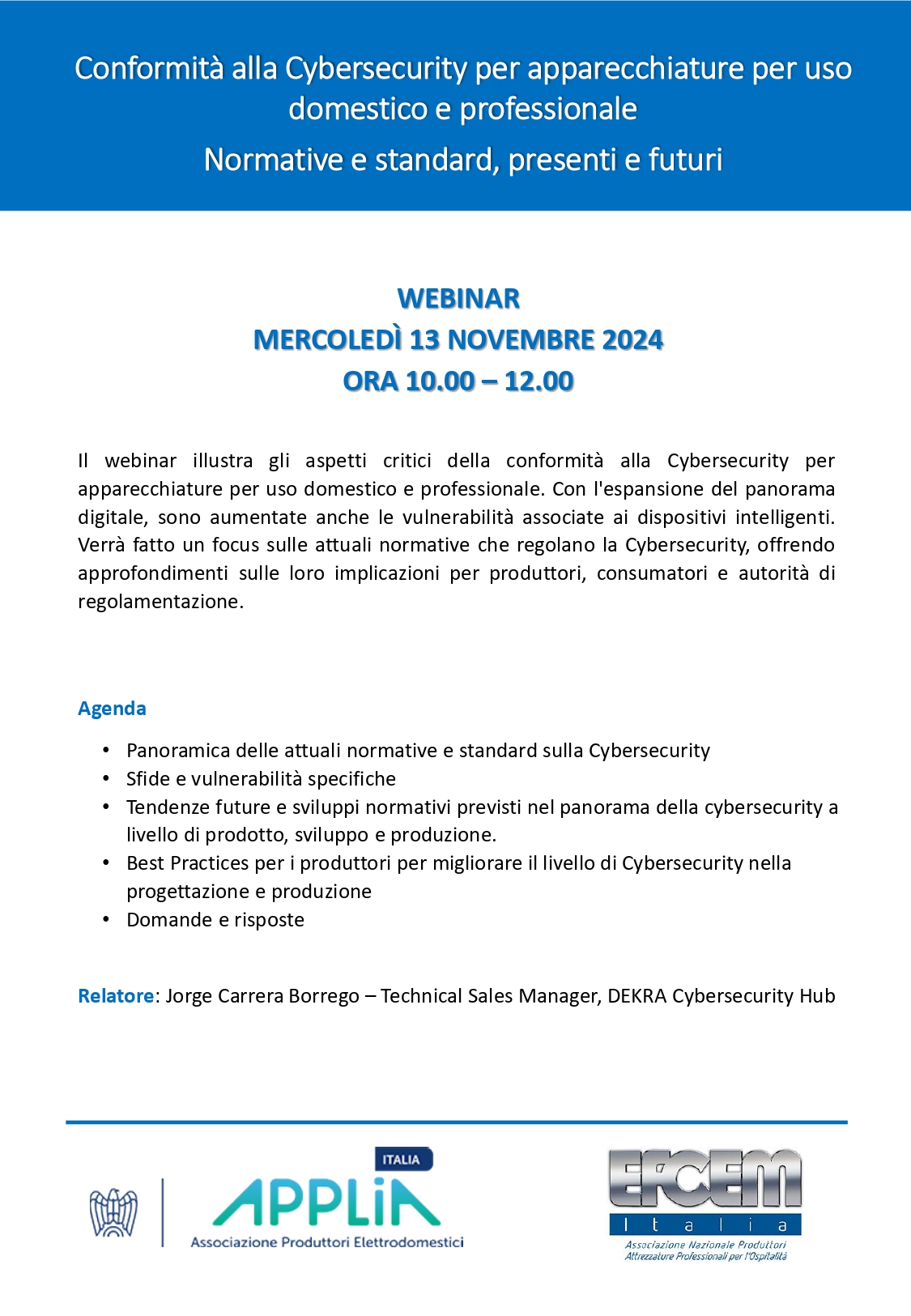 Il webinar illustra gli aspetti critici della conformità alla Cybersecurity per apparecchiature per uso domestico e professionale. Con l'espansione del panorama digitale, sono aumentate anche le vulnerabilità associate ai dispositivi intelligenti. Verrà fatto un focus sulle attuali normative che regolano la Cybersecurity, offrendo approfondimenti sulle loro implicazioni per produttori, consumatori e autorità di regolamentazione.